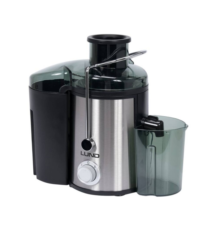 Wysokoobrotowa sokowirówka marki LUND z wydajnym silnikiem o mocy 600W oraz 2-poziomową regulacją prędkości do 13000 obrotów/minutę. Otwór wlotowy o szerokości 65 mm pozwala na wrzucanie dużych kawałków