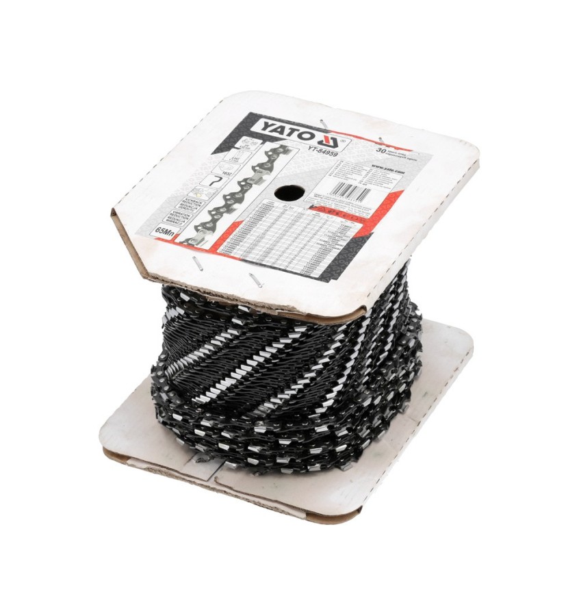 Łańcuch tnący na bębnie do pił łańcuchowych spalinowych i elektrycznych marki YATO. Ząb tnący typu pół-dłuto o dużej szybkości cięcia. Przeznaczone do cięcia drewna czystego i średnio zabrudzonego. Wykonane ze stali manganowej Mn65, która zapewnia podwyższoną wytrzymałość na zrywanie, przez co wydłuża żywotność łańcucha.