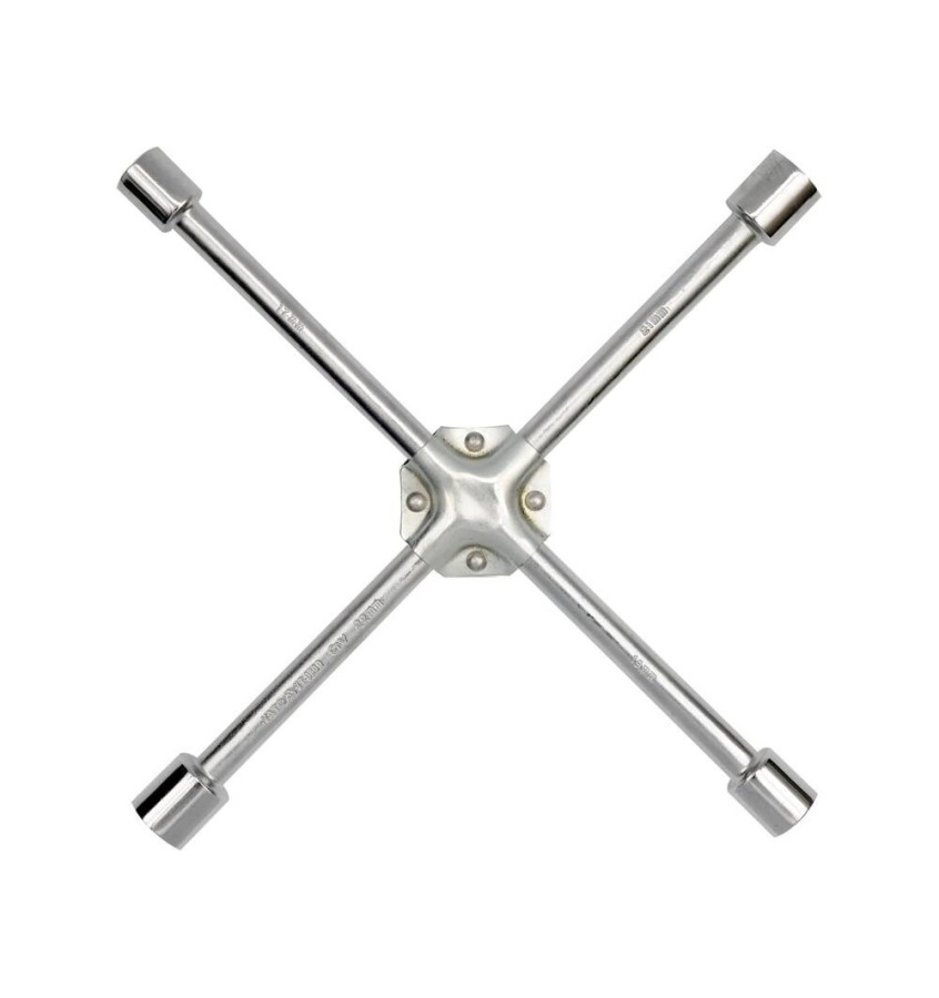 Krzyżakowy klucz do kół samochodowych. Wykonany z wysokiej jakości stali chromo-wanadowej. Posiada 4 ramiona z nasadkami dostosowanymi do wszystkich sześciokątnych, metrycznych rodzajów śrub i nakrętek stosowanych w samochodach osobowych i lekkich dostawczych. Krzyżak został wzmocniony dodatkowo podwójną, nitowaną blachą stalową. Podnosi bezpieczeństwo i komfort użytkowania. Klucz szczególnie polecany do serwisów opon oraz jako wyposażenie samochodów osobowych.