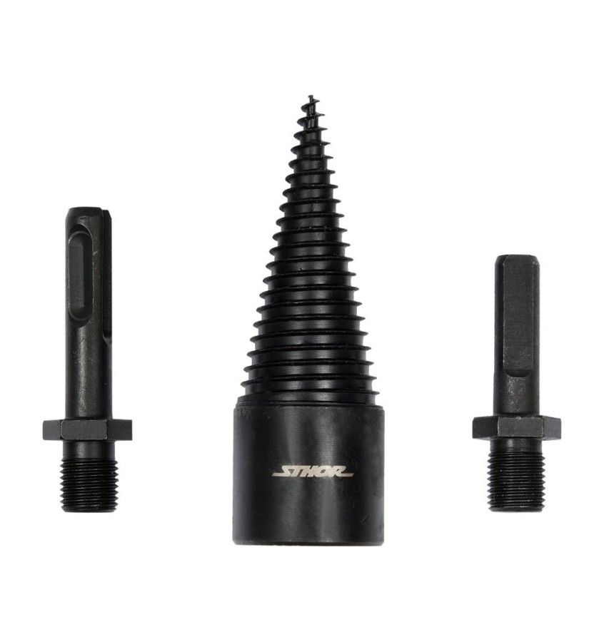 Wiertło do rozłupywania drewna. W zestawie uchwyt SDS Plus oraz uchwyt z trzema powierzchniami płaskimi.