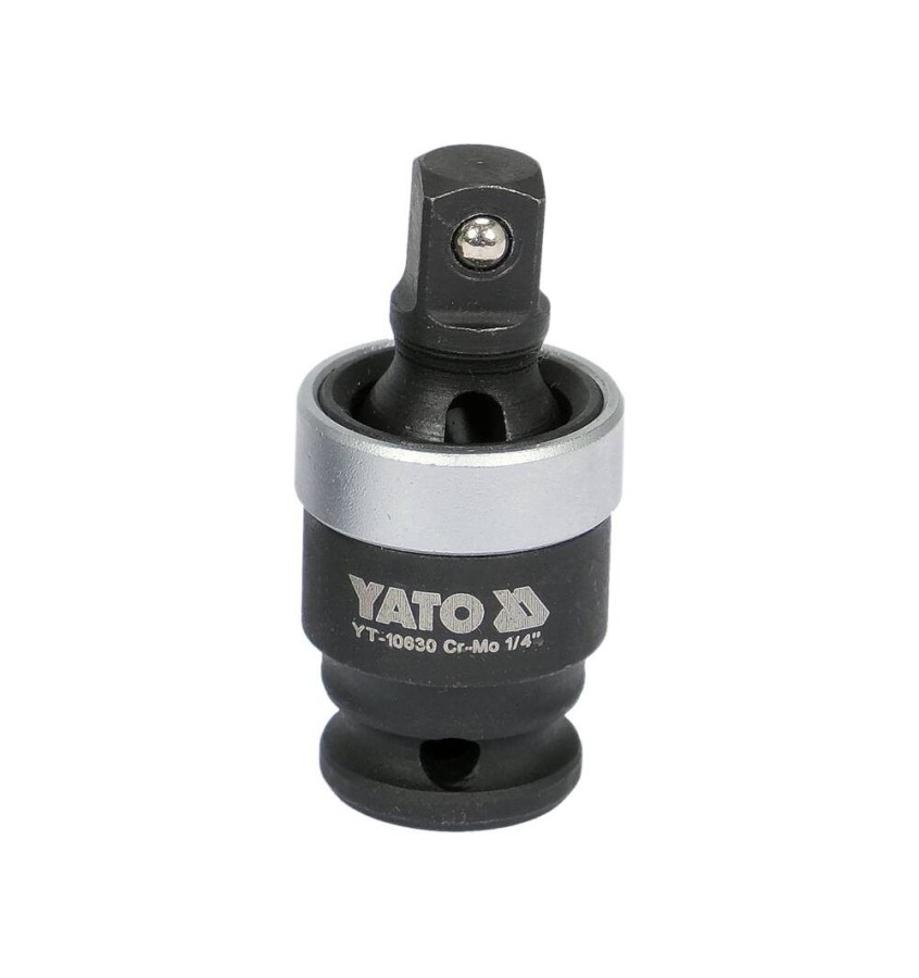 Przegub kulisty, udarowy 1/4''. Wykonany z unikalnej stali stopowej CrMo SCM-440, która ma dwukrotnie większą wytrzymałość na rozciąganie od zwykłej stali węglowej oraz trzykrotnie wyższą granicę plastyczności. Dzięki zastosowanej stali nasadki nie pękają pod wpływem pracy udarowej oraz dłuższy okres zachowują nominalny wymiar.