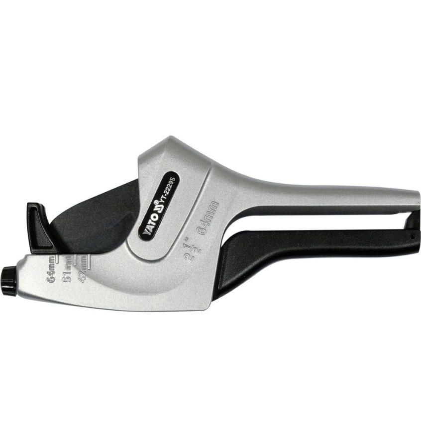 Nożyce do cięcia rur PVC i innych tworzyw sztucznych (PP, PE, PU) oraz peszli. Regulowany wspornik umieszczony na końcu ostrza, pomaga pozycjonować rury o średnicach 40, 50 i 63 mm, co poprawia skuteczność cięcia. Wysokiej jakości ostrze ze stali SK5. Ostrze pokryte powłoką PTFE poprawiającą płynność cięć. Nożyce stosowane do prac hydraulicznych, instalacyjnych, budowlanych.