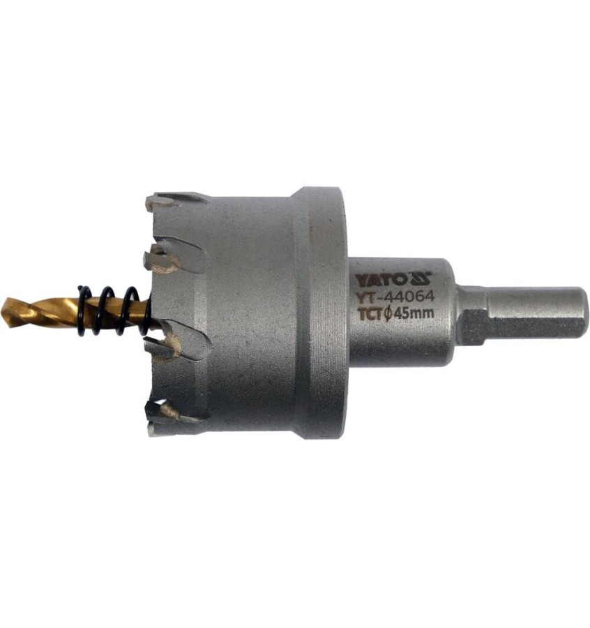 ŚREDNICA: 45MM, GŁĘBOKOŚĆ CIĘCIA: 25MM, DŁUGOŚĆ CAŁKOWITA: 103MM, WĘGLIK SPIEKANY YG10X, MATERIAŁ KORPUSU: STAL WĘGLOWA, MATERIAŁ WIERTŁA PILOT: HSS4341 TIN, ROZMIAR: 6MM, UCHWYT HEX-10MM, 1SZT. KLUCZ IMBUSOWY, 1 SZT. SPRĘŻYNA WYPYCHAJĄCA, ZASTOSOWANIE: STAL KONSTRUKCYJNA (TEOWNIKI HEA, HEB, ROZDZIELNICE ELEKTRCZYNE, SKRZYNKI GAZOWE), STAL NIERDZEWNA, TWORZYWA (ABS, PE, PCV, RÓWNIEŻ ZBROJONE WŁÓKNEM SZKLANYM) .