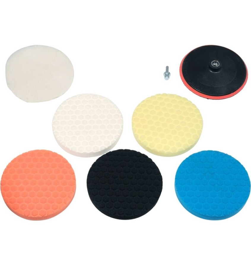 Zestaw do polerowania o średnicy 180 mm. Uchwyt polerski o rozmiarze gwintu M14 wraz z adapterem dla uchwytu 8 mm.