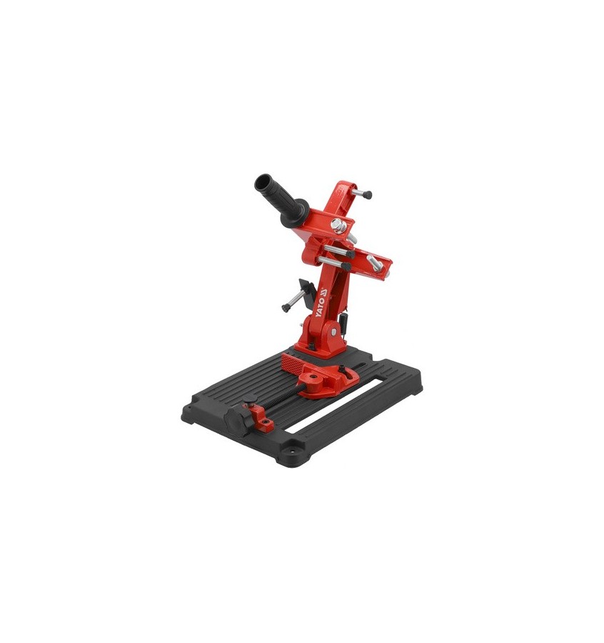 Uniwersalny statyw do pracy ze szlifierką kątową. Stabilna podstawa, wykonana ze staliwa, zintegrowana jest z mocnym imadłem szybkomocującym. Profile nośne o dużym przekroju i podwójna sprężyna powrotna umożliwiają pracę szlifierką o znacznej wadze. Poziomy kąt cięcia ustawiany jest precyzyjnie dzięki pokrętłom.