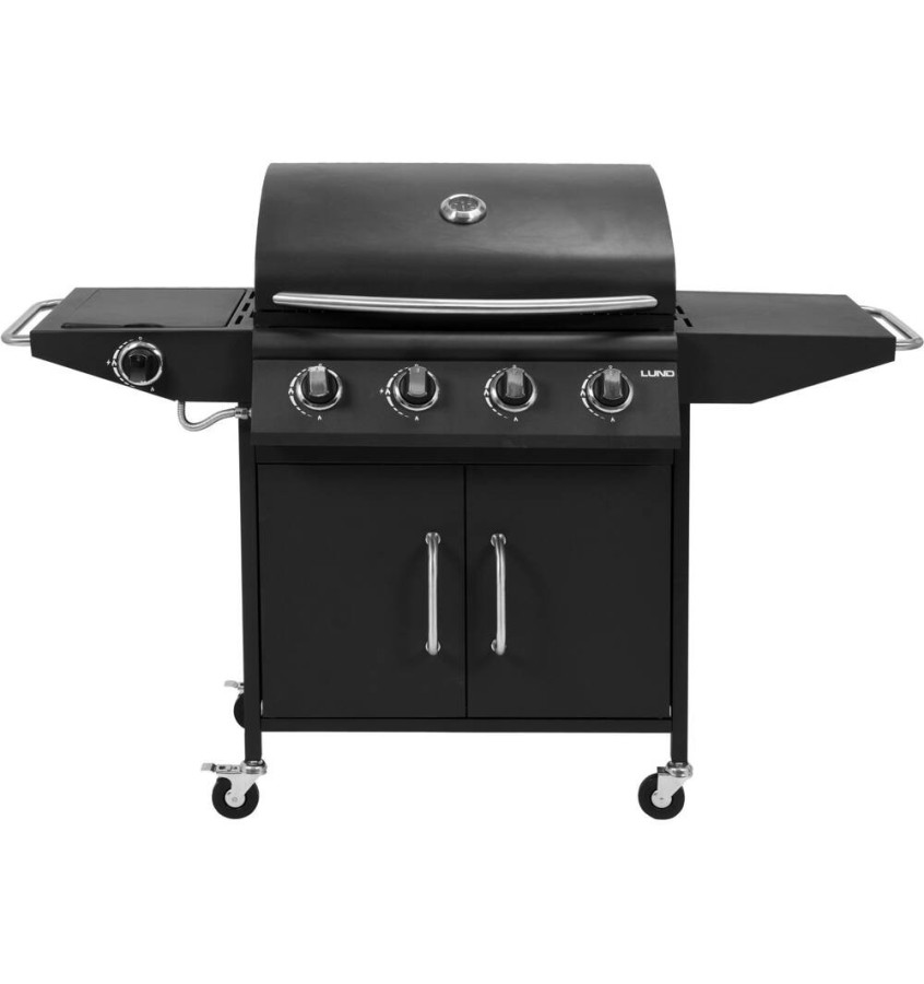 Profesjonalny grill gazowy 4+1 do przygotowywania potraw na świeżym powietrzu, z wygodną regulacją pozwalającą na idealne wypieczenie potraw. Wyposażony w 4 palniki główne i 1boczny o łącznej mocy 16kW. Półki boczne oraz pojemna, zamykana szafka ułatwią przechowywanie przypraw i niezbędnych akcesoriów