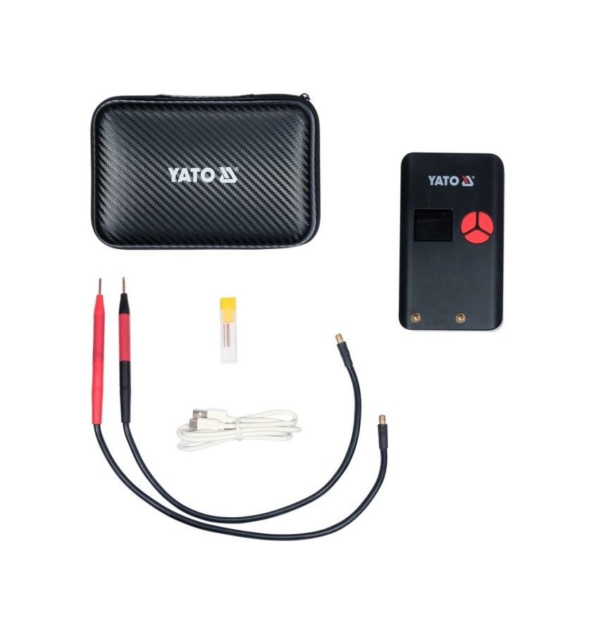 Urządzenie daje maksymalny prąd zgrzewania na poziomie ~500 A. Jest to średnia realna wartość natężenia prądu mierzona w okresie 100 ms. Niektórzy producenci zamiast realnego prądu zgrzewania podają parametry prądowe mosfetów lub wartość prądu szczytowego. Z punktu widzenia danych technicznych jest to prawda, jednak w praktyce uzyskanie prawidłowego zgrzewu przy użyciu taśmy niklowanej o grubości 0,15 mm często staje się niemożliwe. Przenośna zgrzewarka punktowa YATO umożliwia wykonanie prawidłowych zgrzewów przy uzyciu taśm niklowanych o szerokości 8 mm i grubości 0,20 mm oraz taśm niklowych o szerokości 8 mm i grubości 0,15 mm.
