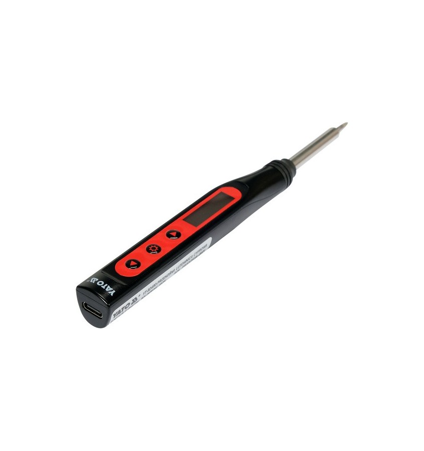Przenośna lutownica cyfrowa na groty T-12 zasilana przez port USB-C. Groty T12 to połączenie zatopionego w ceramice drutu oporowego, czujnika temperatury oraz wysokiej jakości końcówki lutowniczej. Zintegrowana konstrukcja grotu umożliwia ekspresowe nagrzewanie oraz bardzo szybkie działanie stabilizacji temperatury. Lutownica współpracuje z dowolnym źródłem zasilania o napięciu od 9 do 24 voltów DC i wydajności prądowej powyżej 1,5 A. Mogą to być zarówno szybkie ładowarki do telefonu, zasilacze do laptopa, powerbanki z portami w technologii QC lub PD, zespół ogniw li-ion, niektóre adaptery podróżne YATO i wiele, wiele innych.