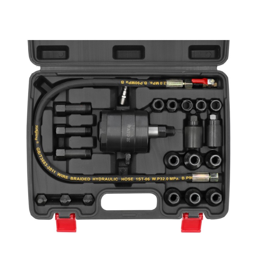 Zestaw przeznaczony do demontażu wtryskiwaczy Bosch, Delphi, Denso i Siemens w silnikach benzynowych i diesla. Zawiera 21 elementów w walizce z tworzywa sztucznego BMC.