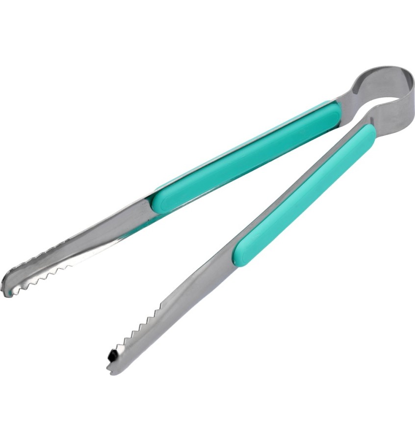 Szczypce gastronomiczne przeznaczone do użytku z frytkownicami beztłuszczowymi. Zabezpieczenia rękojeści z tworzywa chronią przed poparzeniem dłoni. Kolor turkusowy.