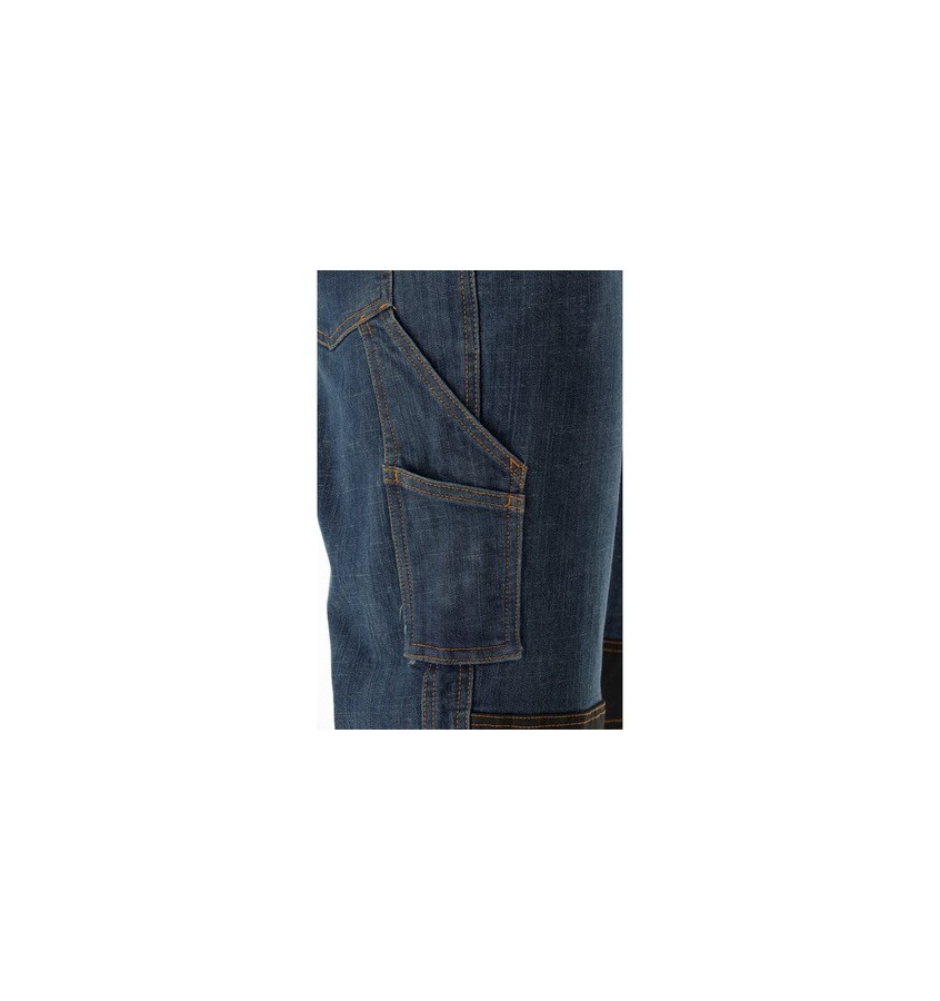 Spodnie robocze monterskie z serii MARA z elastanem wykonane z rozciągliwego jeansu. Dziesięć kieszeni, w tym kieszeń multifunkcyjna na lewej nogawce. Na kolanach otwory na wkładki nakolannikowe. Liczne stębnowania oraz nity wzmacniają łączenia materiałów w miejscach najbardziej narażonych na rozdarcie