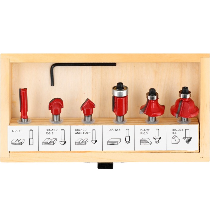 Zestaw 6 frezów trzpieniowych do obróbki drewna i niektórych tworzyw sztucznych przy użyciu frezarki z uchwytem fi 6 mm. Trzy frezy krawędziowe zakończone są łożyskiem ułatwiającym prowadzenie narzędzia. Zestaw zapakowany w drewnianej kasetce.