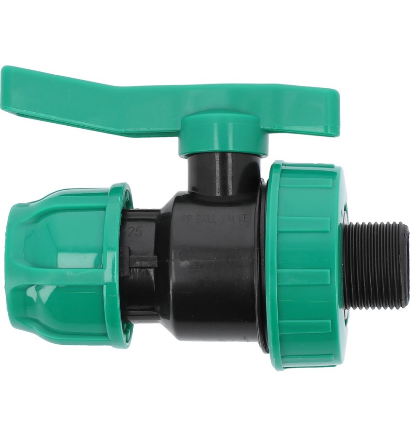 Zawór kulowy męski 25 mm x 3/4" przeznaczony do łączenia rur PE, PP w instalacjach wodnych.