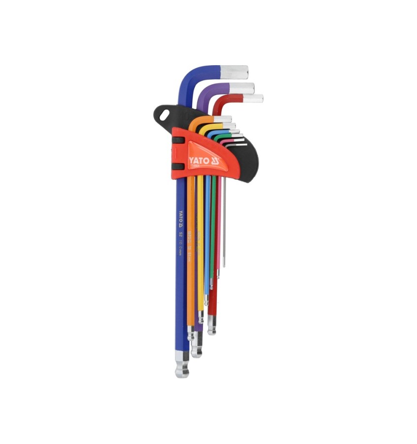 Zestaw 9 bardzo długich kluczy imbusowych w rozmiarach 1,5-10 mm z końcówką kulistą.