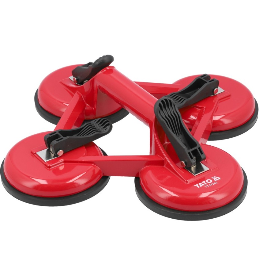 Uchwyt z 4 przyssawkami do przenoszenia elementów o płaskiej, gładkiej powierzchni, np. szyb okiennych, samochodowych, arkuszy blach, płytek ceramicznych, płyt laminowanych.