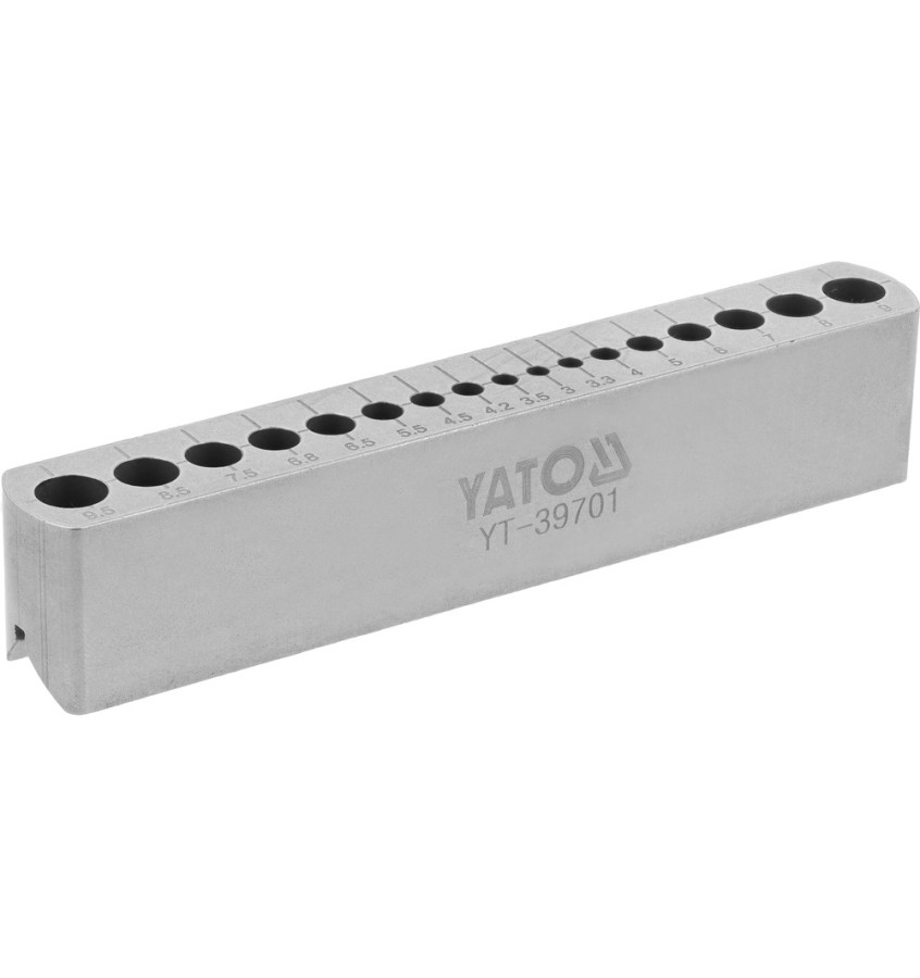 - 17 otworów do wierteł o średnicach: 3, 3,2, 3,5, 4, 4,2, 4,5, 5, 5,5, 6, 6,5, 6,8, 7, 7,5, 8, 8,5, 9, 9,5 mm