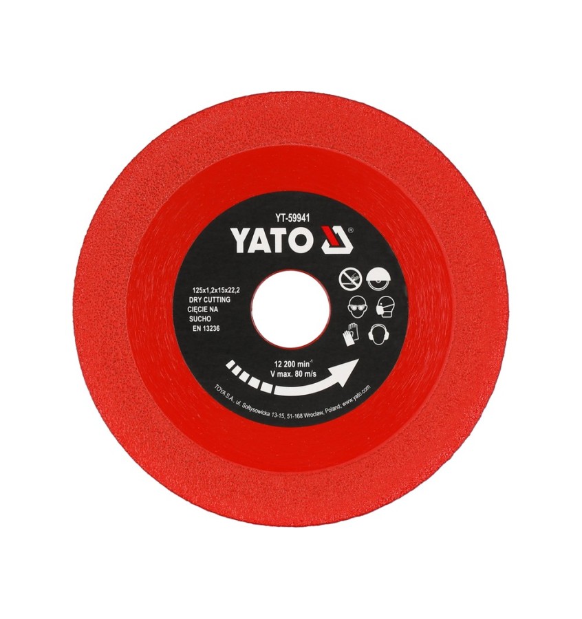 Tarcza diamentowa do pracy na sucho, przeznaczona do cięcia szkła, ceramiki, gresu oraz terakoty. Doskonale sprawdzi się w profesjonalnych zastosowaniach oraz przy pracach kreatywnych ze szkłem. Wykonana w technologii diamentu lutowanego próżniowo. Służy do precyzyjnego cięcia, szlifowania krawędzi oraz fazowania kafli. Konstrukcja tarczy zapewnia równomierną pracę bez bicia bocznego, co przekłada się na wysoką jakość cięcia bez odprysków. Powierzchnia tarczy pokryta jest farbą antykorozyjną, co zwiększa jej trwałość. Pasuje do szlifierek kątowych (takich jak: YT-82101, YT-821024, YT-82097, YT-828293) i przecinarek do gresu (takich jak: YT-82159, YT-821591).