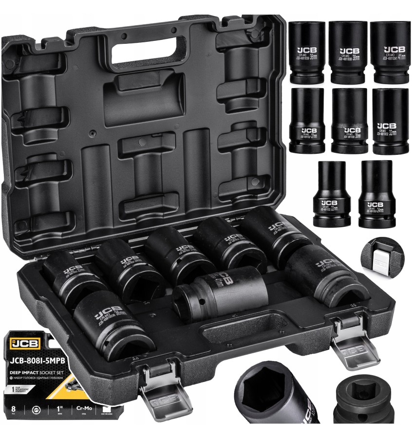 Zestaw zawiera sześciokątne, głębokie nasadki udarowe w popularnych rozmiarach od 22 do 41 mm