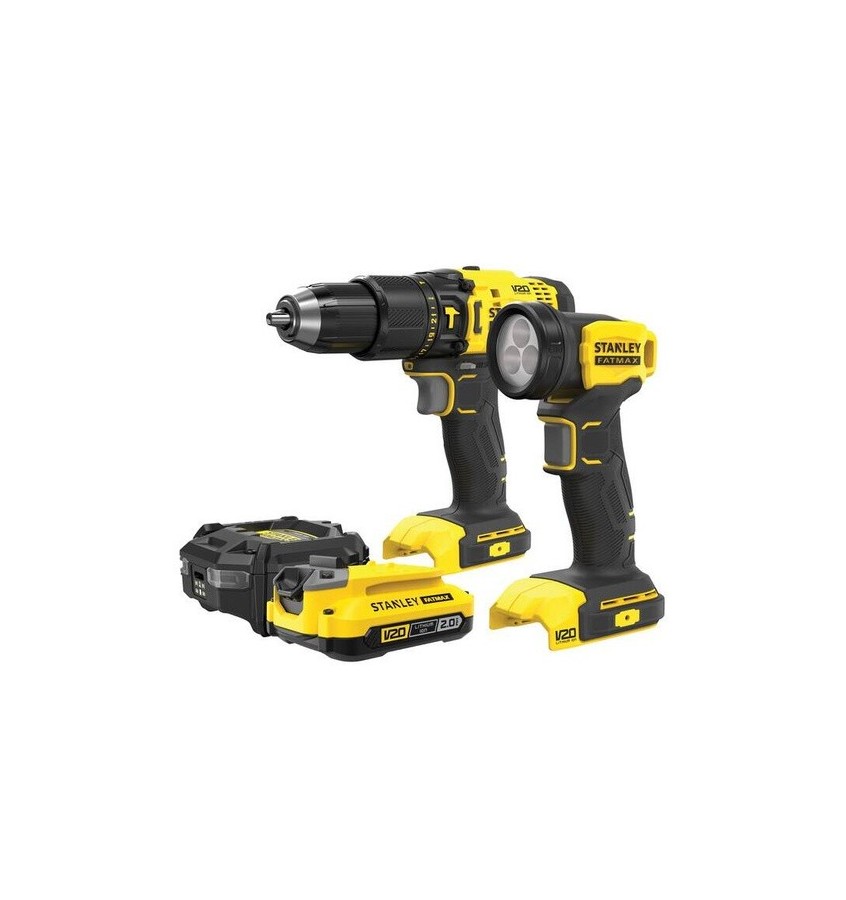 Zestaw elektronarzędzi Stanley Fatmax SFMCK210D1 to gotowy do pracy zestaw, składający się z wiertarko-wkrętarki z udarem oraz latarki z serii Stanley Fatmax V20, wraz z zestawem zasilającym, składającym się z akumulatora o pojemności 2,0 Ah i ładowarki.
