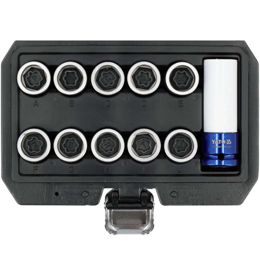 Zestaw nasadek do śrub zabezpieczających w samochodach marki Toyota. Przeznaczony do użytku w profesjonalnych warsztatach samochodowych i wulkanizacyjnych.