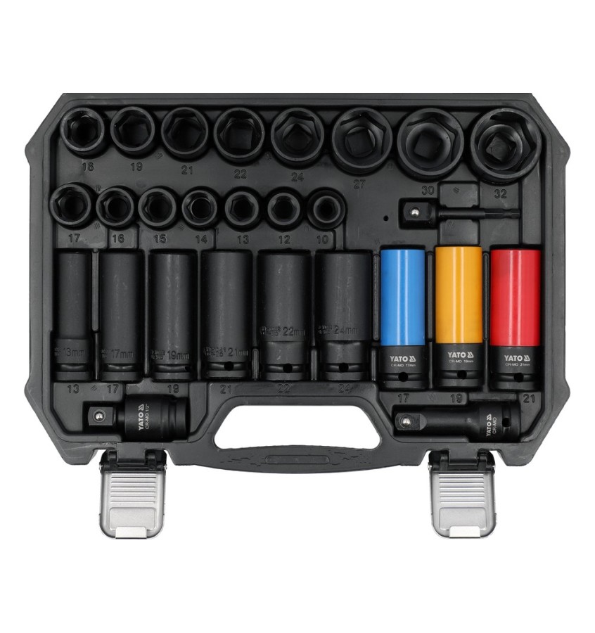 - nasadki udarowe 1/2” (krótkie): 10, 12, 13, 14, 15, 16, 17, 18, 19, 21, 22, 24, 27, 30, 32 mm