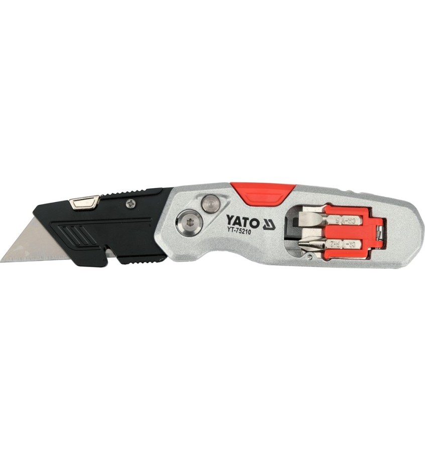Nożyk z ostrzem trapezowym przeznaczony do prac montażowych i magazynowych wymagających stabilnego prowadzenia ostrza oraz odporności na obciążenia. Korpus wykonany ze stopu aluminium i cynku zwiększa wytrzymałość narzędzia, a jednocześnie poprawia pewność chwytu podczas cięcia twardszych materiałów. Ostrze ze stali narzędziowej SK5 zapewnia trwałość krawędzi oraz powtarzalną jakość cięcia. W rękojeści umieszczono praktyczny magazynek na bity, dzięki czemu narzędzie może pełnić również funkcję prostego wkrętaka serwisowego.