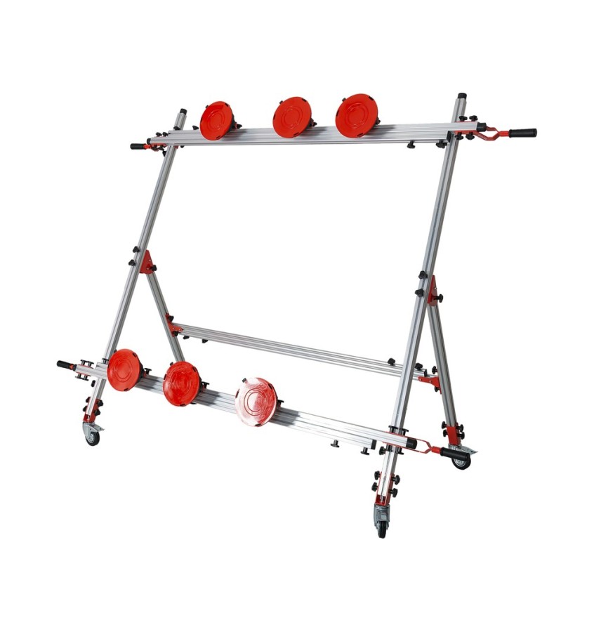 Solidny i wszechstronny uchwyt transportowy zaprojektowany z myślą o bezpiecznej i stabilnej manipulacji arkuszami wielkoformatowymi, zarówno podczas przenoszenia, jak i ustawiania materiału w miejscu montażu. Konstrukcja systemu opiera się na dwóch prowadnicach ze stopu aluminium, wysuwanych w zakresie 160-360 cm oraz sześciu wytrzymałych przyssawkach próżniowych, których punkty mocowania można precyzyjnie wyregulować w zależności od kształtu materiału, zapewniając doskonałą nośność i niezawodność na stanowisku pracy.