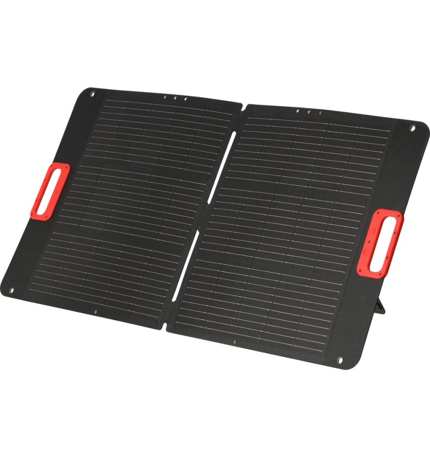 Składany panel solarny o mocy wyjściowej 100 wat jest przenośnym źródłem energii. Laminacja ogniwa słonecznego z ETFE gwarantuje odporność na warunki atmosferyczne. Regulacja wsporników pozwala ustawić panel w dogodnej pozycji względem promieni słonecznych lub zawiesić w wybranym miejscu dzięki czterem otworom montażowym. Panel po złożeniu ma niewielkie wymiary, które w połączeniu z wbudowanymi uchwytami sprawiają, że jest łatwy w przenoszeniu.