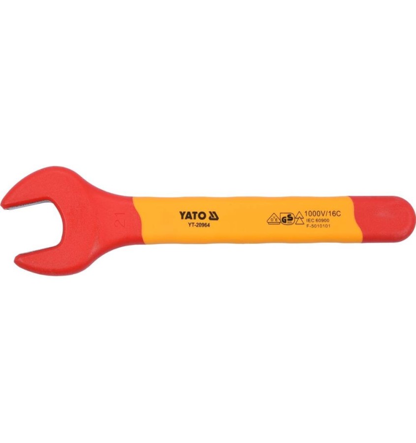 Izolowany klucz płaski marki YATO YT-20964. Wykonany z wytrzymałej, narzędziowej stali chromowo-wanadowej CrV. Wielokomponentowa rękojeść z certyfikatem VDE zapewnia izolację do 1000 V, dzięki czemu narzędzie może być stosowane podczas pracy przy instalacjach niskonapięciowych.
